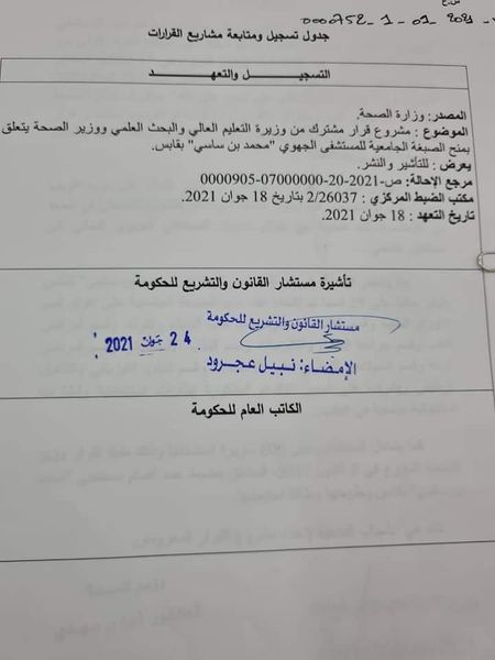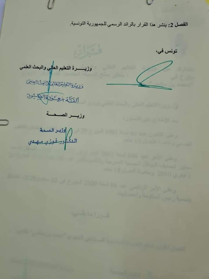 وتم يوم الخميس الماضي التأشير على هذا القرار من قبل مستشار القانون والتشريع برئاسة الحكومة على أن يتم نشره بالرائد الرسمي للجمهورية التونسية في النشرية القادمة وفق نص الوثيقة.